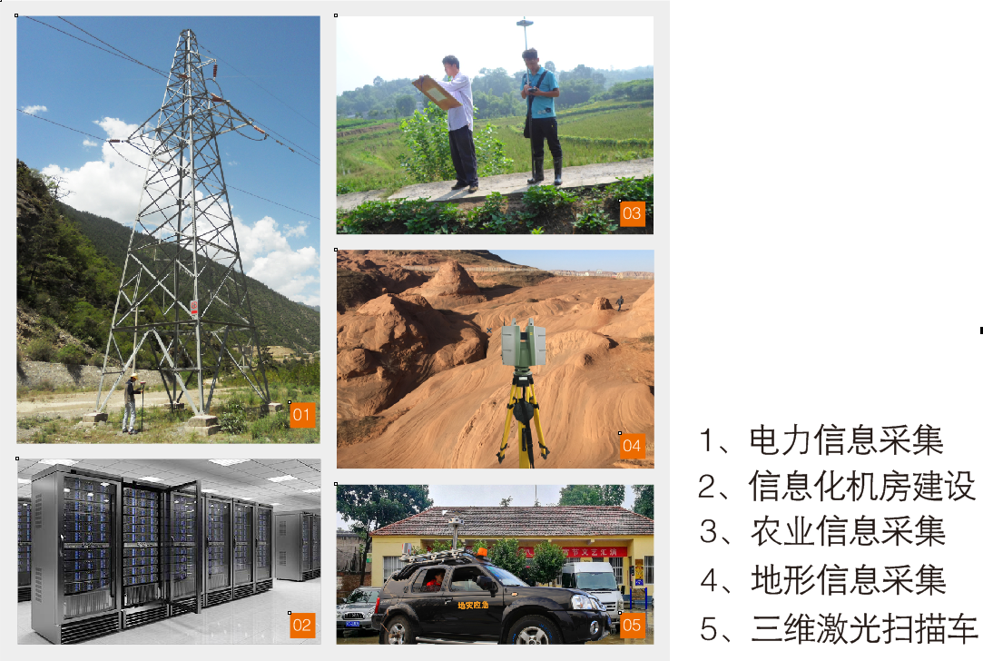 地理信息數據采集包括城市興趣點、城市部件、城市網格、公安消防、農業水利設施、電力線路及設備、交通信息、礦產資源信息、管網信息、地質災害點、旅游景點、土壤及各種比例尺地形圖數據采集等。
