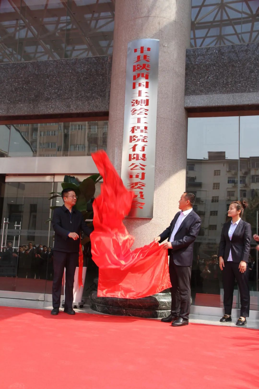 在雄壯的樂曲聲中,集團公司黨委副書記安增會、測繪院黨委書記、執行董事、總經理馮永強共同為“中共陜西國土測繪工程院有限公司委員會”、“陜西國土測繪工程院有限公司”揭牌。馮永強宣布陜西國土測繪工程院有限公司正式入駐地質資料樓。