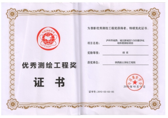 優秀測繪工程獎證書