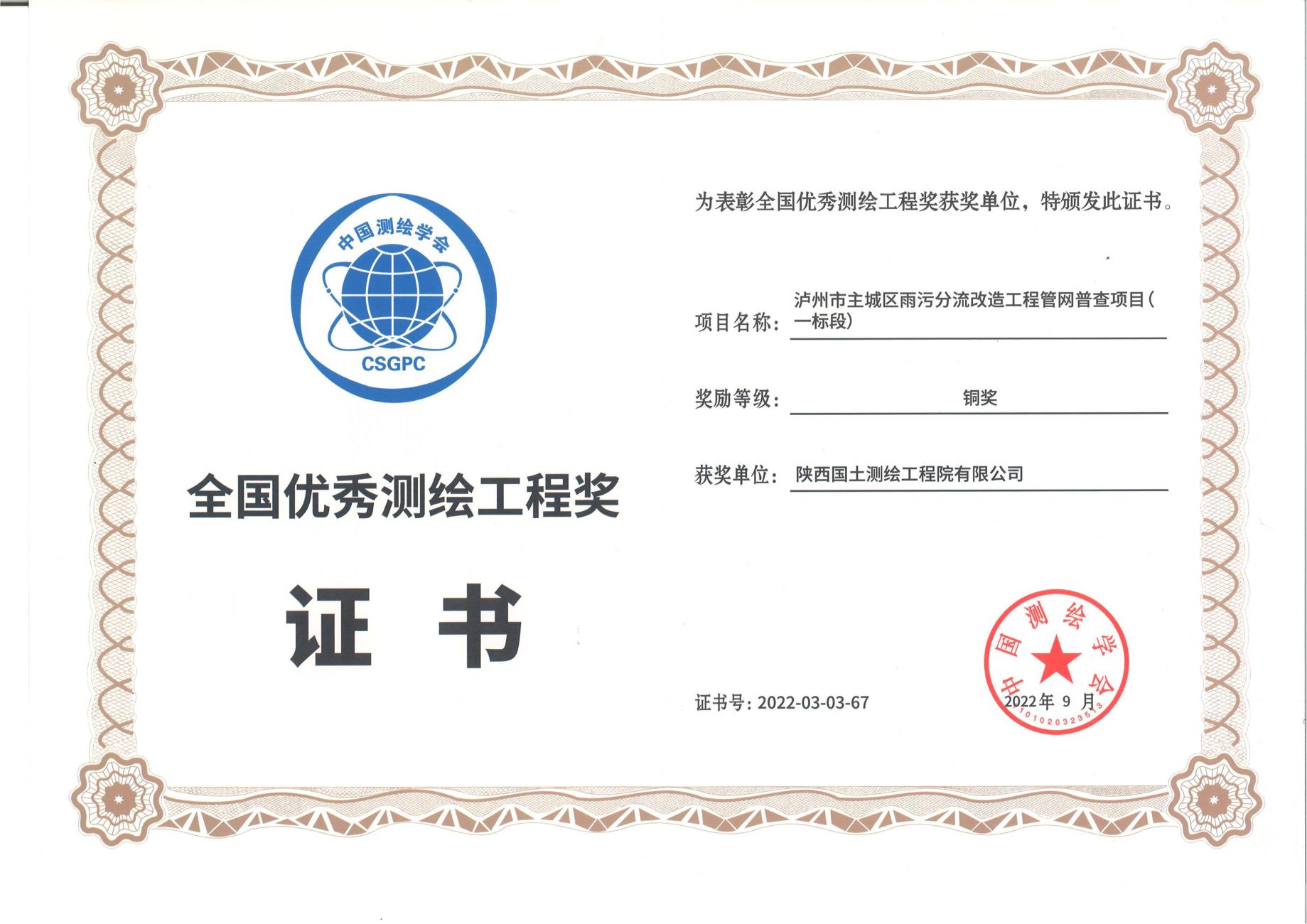 近日,“中國測繪學會2022年優(yōu)秀測繪工程獎”所有獎項頒發(fā)完畢。陜西國土測繪工程院有限公司“瀘州市主城區(qū)雨污分流改造工程管網(wǎng)普查項目(一標段)”項目脫穎而出,榮獲“2022年全國優(yōu)秀測繪工程銅獎”。這是繼2019年以來測繪院項目連續(xù)三年獲得優(yōu)秀測繪工程銀獎后,又一次獲得該獎項。
