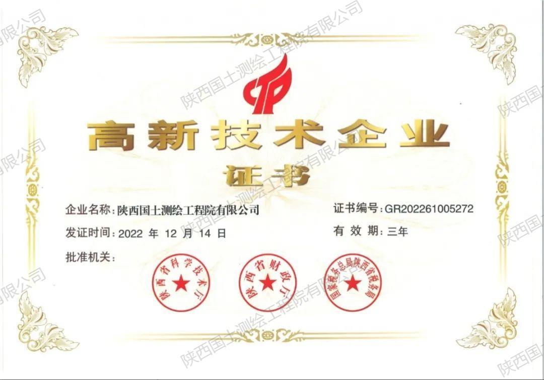 2022年12月,陜西國(guó)土測(cè)繪工程院有限公司被認(rèn)定為國(guó)家高新技術(shù)企業(yè),并于近日頒發(fā)了高新技術(shù)企業(yè)證書。