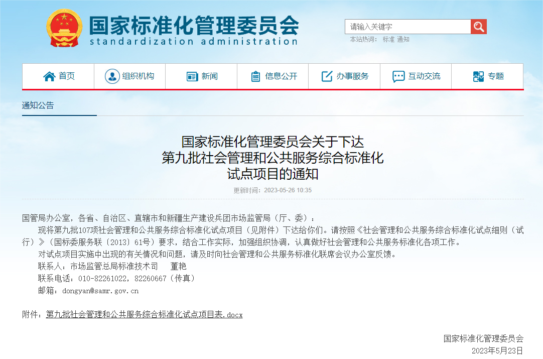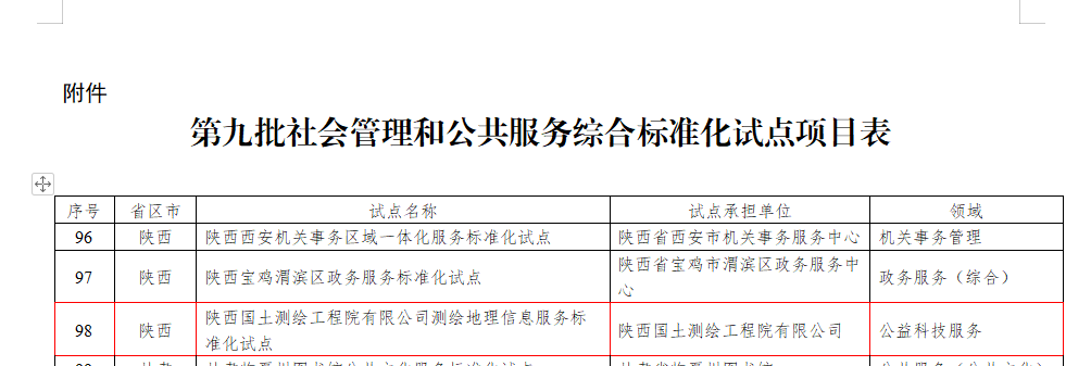 2023年5月23日,國家標(biāo)準(zhǔn)化委員會下達(dá)了第九批社會管理和公共服務(wù)綜合標(biāo)準(zhǔn)化試點項目,陜西國土測繪工程院有限公司申報的“測繪地理信息服務(wù)標(biāo)準(zhǔn)化試點”獲批立項。
