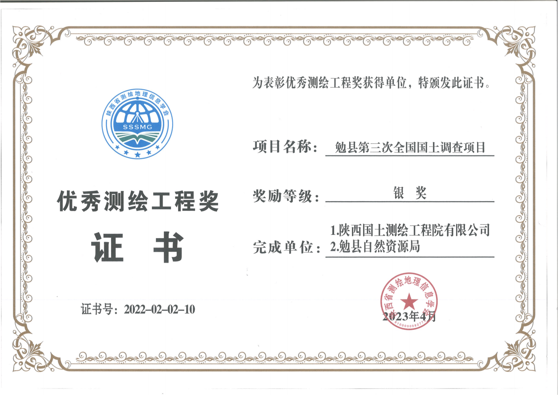 近日,陜西國土測繪工程院有限公司實施的《勉縣第三次全國國土調(diào)查項目》獲評陜西省測繪地理信息學會“2022年度陜西省優(yōu)秀測繪工程獎”銀獎。