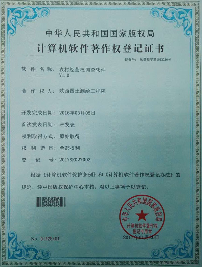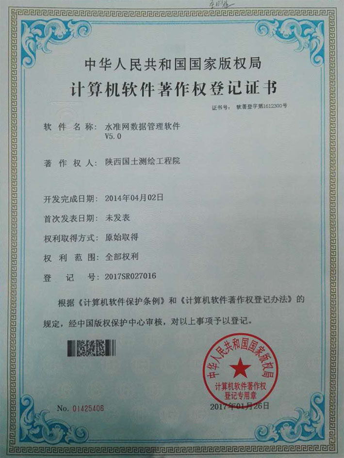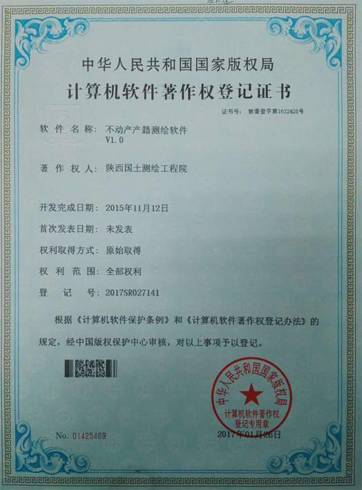 陜西國土測繪工程院,自2016年10月,啟動了自主開發(fā)的計算機軟件著作權(quán)登記工作,清理了近三年來測繪院自主開發(fā)的軟件項目。2016年11月向國家版權(quán)局送報申請,通過了國家版權(quán)局審核、公示等程序。國家版權(quán)局于2017年2月向測繪院頒發(fā)了著作權(quán)登記證書。